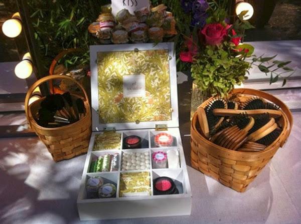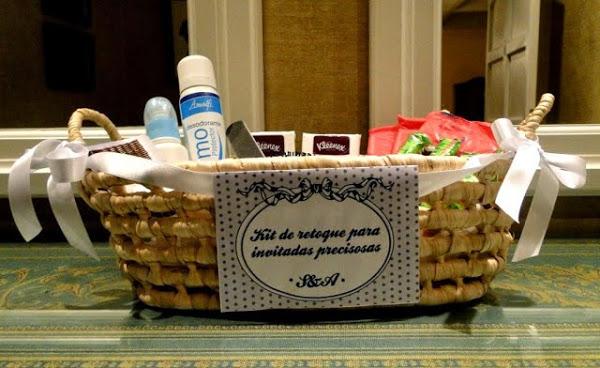 Las chicas sobretodo agradecerán este detalle. Podéis colocar una cesta en el baño con peines, laca, productos de higiene como seda dental, pañuelos, compresas, pintalabios, perfume, desodorante... incluso enjuague bucal, y es que nunca se sabe lo que puede pasar. Todo lo que se os ocurra que vuestras invitadas pudieran necesitar tiene cabida en este kit, y lo mejor de todo es que podéis prepararlo vosotras mismas. ¡Mirad que cucas pueden quedar las cestitas!: