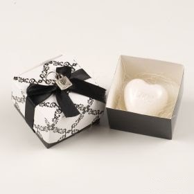 Un jabón con forma de corazón presentado en una cajita regalo con aire vintage