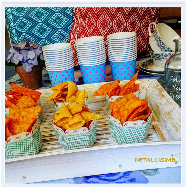 En esta foto, en una merienda con toques salados, nuestras tarrinas hexagonales de cuadritos y flores nos sirven para servir aperitivos salados. Al fondo, nuestros vasos azules con lunares rosas, por aquello de que lunares y cuadros, combinan perfectamente y no rompen la armonía de nuestra mesa