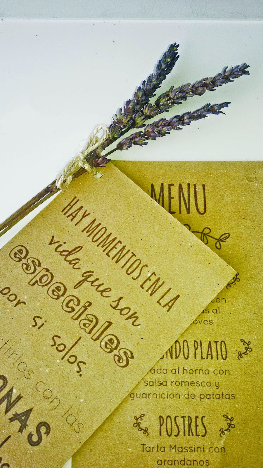 Se puede imprimir en cartulina Kraft para darle un toque rústico, yo por ejemplo para completarlo he cogido unas ramitas de lavanda que tenia y un poco de cuerda rústica, he hecho un agujero en la parte superior para unirlas, pero que a la vez el invitado las pueda separar para ver correctamente el menú.