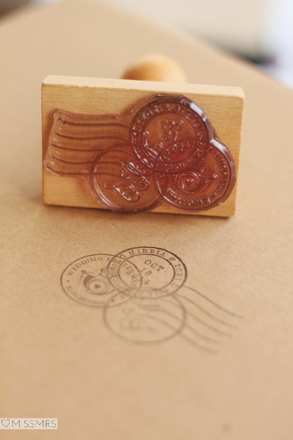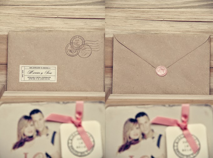 Decidimos envolver cada una de las postales con una cinta de otomán (o groguen) de color rosa en la cual se encontraba una tarjetita con los datos de los novios, y además diseñamos un sello triple especialmente para su boda, el cual estampamos en la parte frontal del sobre donde iba colocado junto a una etiqueta con el nombre de cada invitado como si de una carta antigua se tratara.