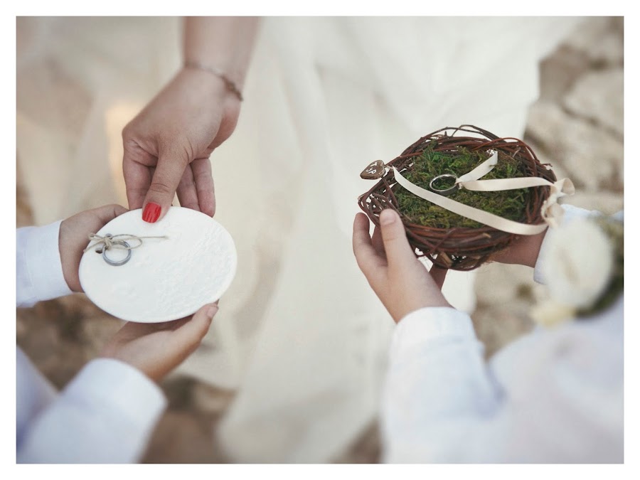Las alianzas, como ya os conté aquí las elegimos de titanio, no voy a repetirme contando lo mismo por que si no hoy esto se convertirá en el post interminable jajaja! Utilizamos dos porta alianzas, por varios motivos, nos hacia mucha ilusión que tres de nuestros sobrinos llegasen con nosotros, digo tres porque el cuarto tenía un mes y cinco días en la boda. A la niña, que con lo alta que es ya parece una mujerzuela le encargamos un ramito de paniculata que aún conserva y que le hizo mucha ilusión llevar y los dos niños llevaron cada uno el anillo de uno de sus tíos, para nosotros fue muy importante, se nos cae la babita con ellos. Otro de los motivos es que a mi me hacia mucha ilusión llevar y tener el recuerdo de que dos de mis nuevas amigas bloggers me hiciesen cada una uno.
