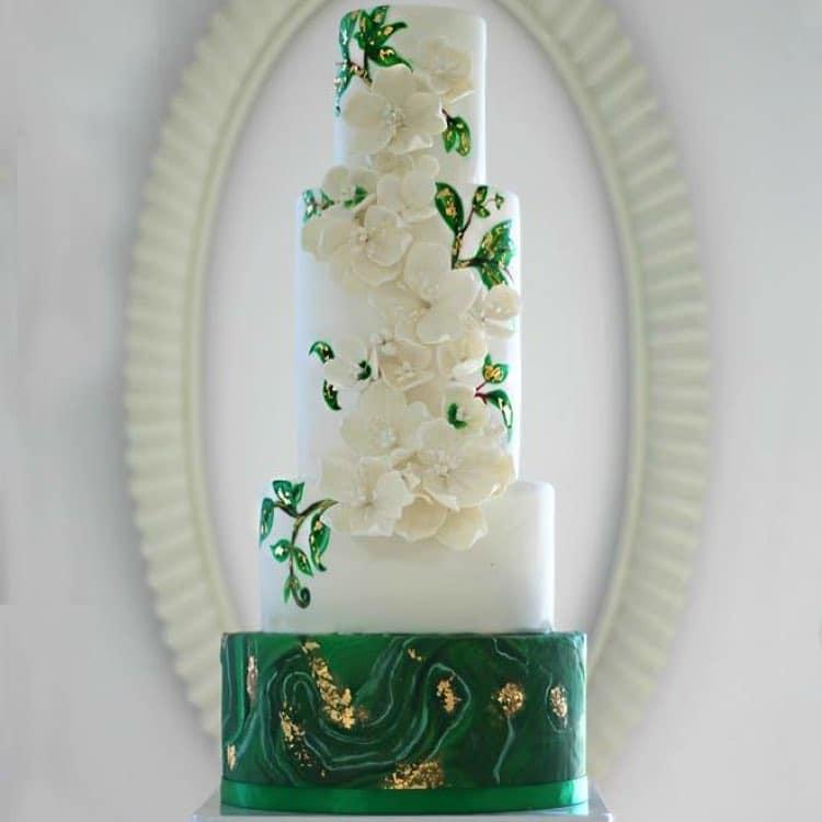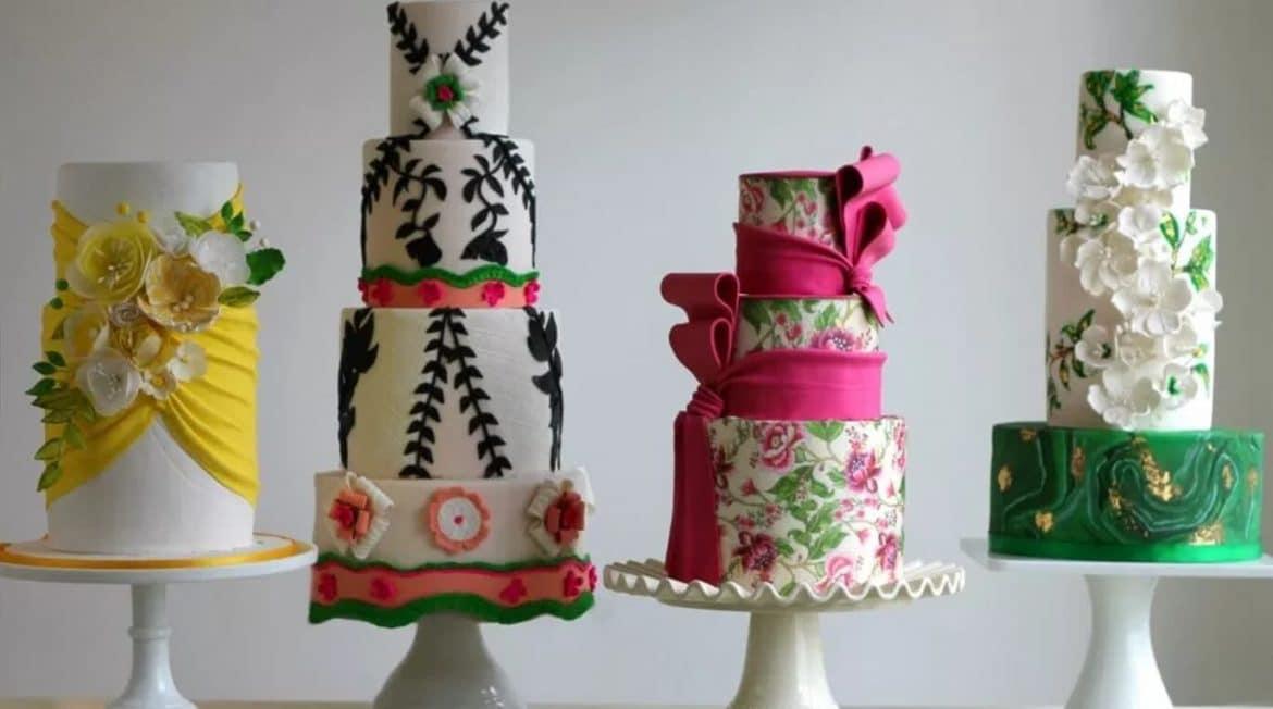 Sus tartas de bodas son muy originales, no le importa usar el color si es necesario y si los novios lo requieren. Tiene acabados perfectos y muy ricos en detalles, aunque no son recargados. Las formas de los bizcochos son súper originales, formando estructuras fuera de lo clásico.