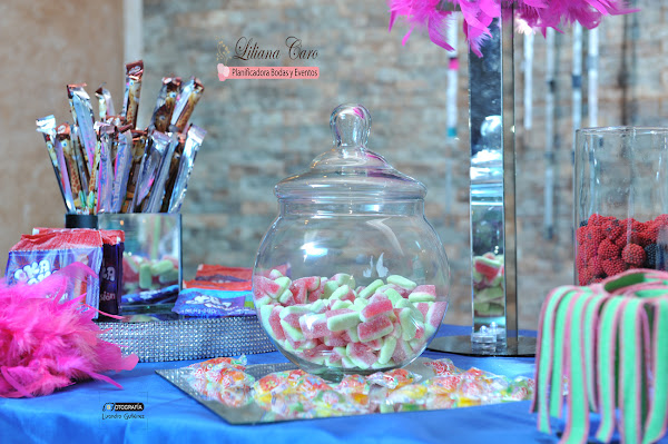 La decoración incluía unas muñecas que elaboré con una base y recreé los cuerpos, hice los vestidos, plumas, lentejuelas y las personalicé; les acompañaban unos antifaces y collares negros y azules turquesa.. las telas en el techo no podían faltar y por supuesto, la mesa de dulces.