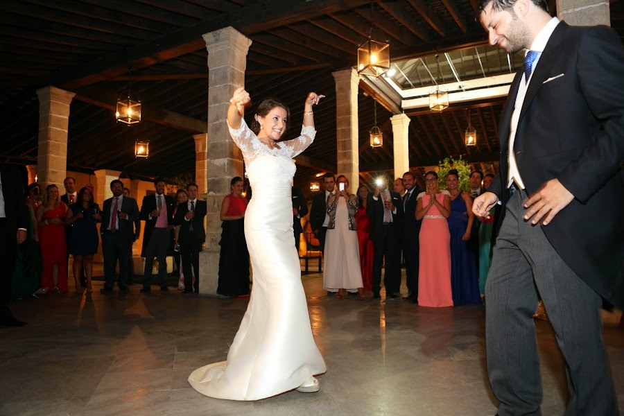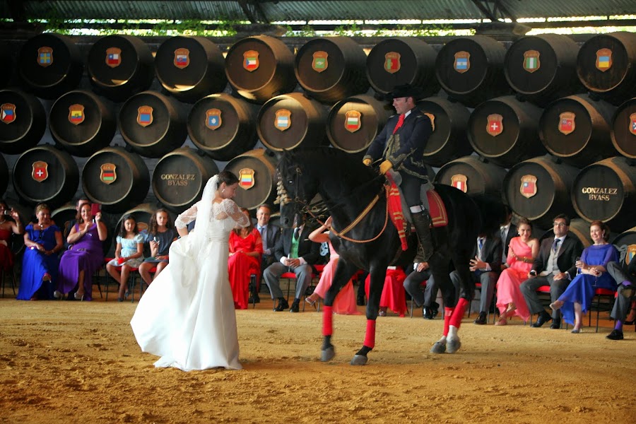 A mi me apasiona el baile flamenco, desde que era una niña he estado siempre en academias de baile, y por mis raíces lo llevo en la sangre. Cuando decidimos ofrecer a los invitados un espectáculo de caballos, ese momento era para hacernos las fotos. Pero el fotógrafo nos convenció para quedarnos un rato y luego irnos. Totalmente de imprevisto, la bailaora que estaba con el caballo se dirigió hacia nosotros y nos sacó a bailar. Al principio me negué, pero una vez que estábamos allí, "de perdidos al río" y este fue el resultado: