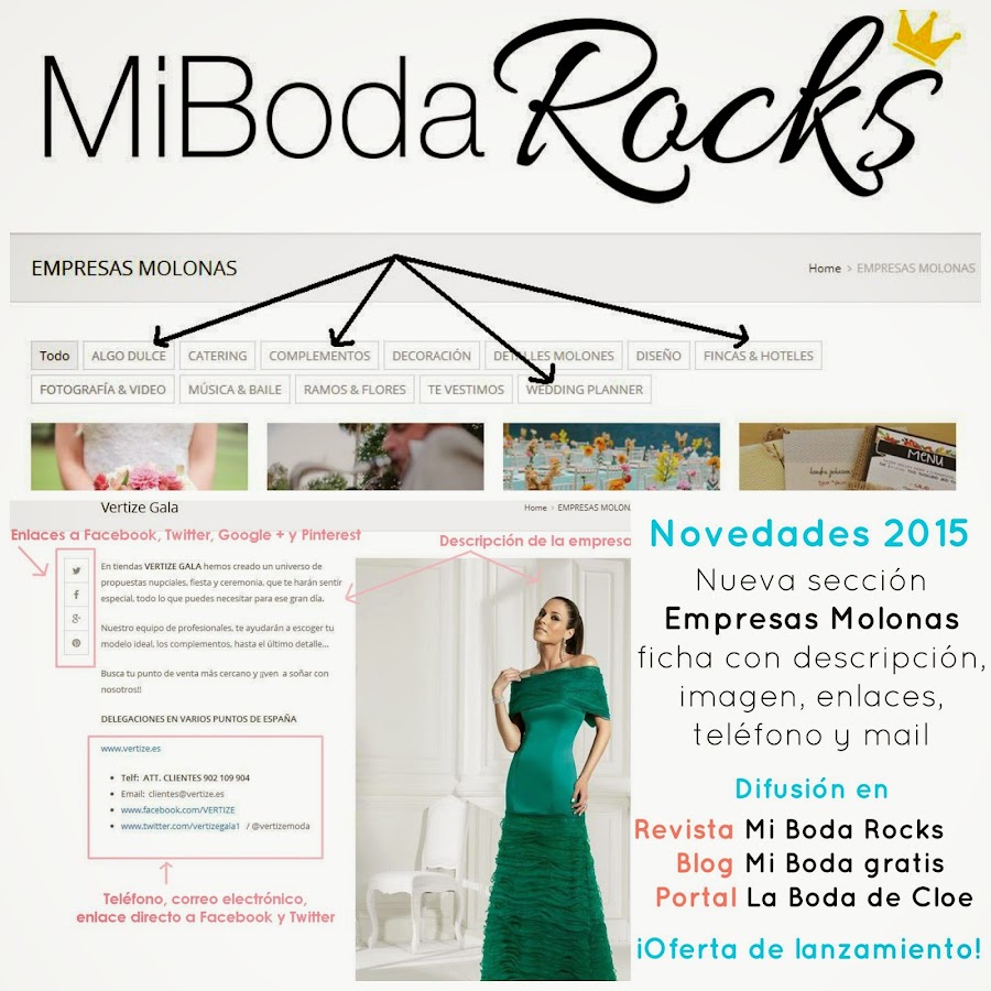 Como sabéis además de escribir en Mi Boda gratis soy una de las fundadoras de la plataforma de bodas Mi Boda Rocks, que engloba Revista de Bodas online gratuita, organización de Showrooms para novias y empresas molonas en Madrid, Barcelona y Valencia, Guía de Empresas Molonas, Blog de Bodas Mi Boda gratis y Portal de Noticias La Boda de Cloe.