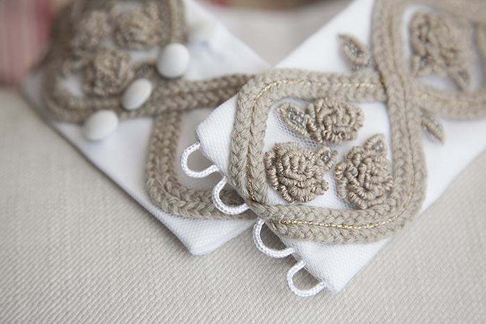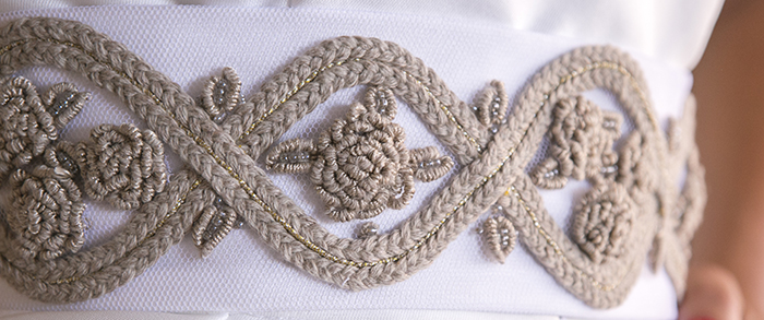 Un cinturón de lino bordado y trenzado con pedrería, siguiendo el tono de los zapatos y del tocado