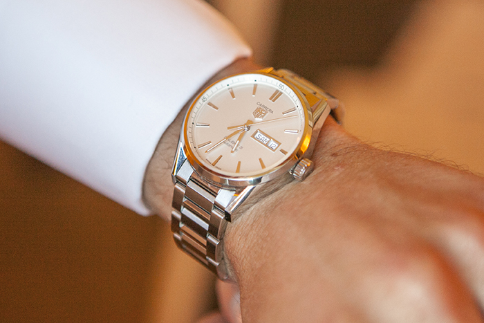 He wore the watch I offert him the day of our engagement a Tag-Heuer Carrera, with a classic style. A very special jewel that will go from father to son.