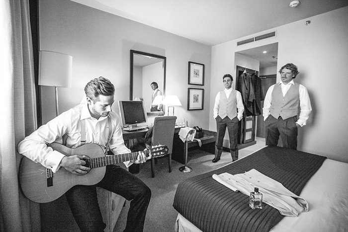Antoine got dress together with two of his best man, Yann his childhood frien and his big brother Jean-Marie, a very special momment in which they played guitar and drunk champagne (courtesy of our friends Cristian y Noemi, thank you guys, that was awesome!)