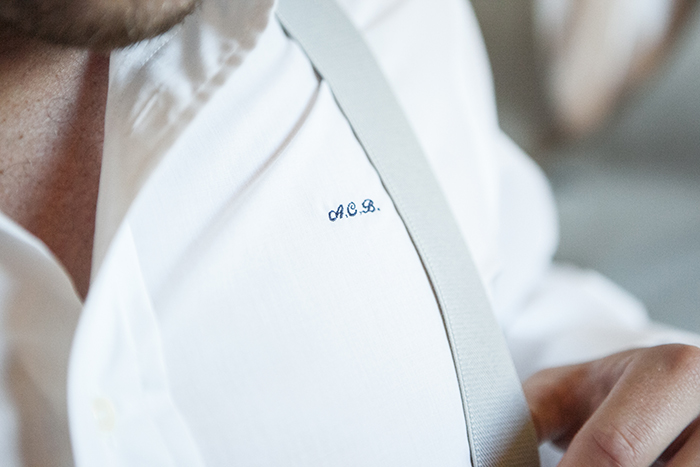 Camisa blanca también de Guzmán con sus iniciales grabadas en azul marino.