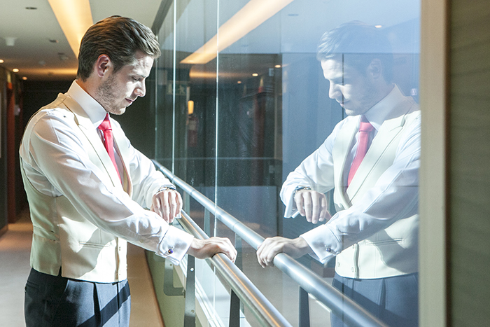 As the occasion required Antoine choose a swallowtail for the wedding day, he chose it in navy blue , with a yellow waistcoat and a red tie, everything from Guzmán.