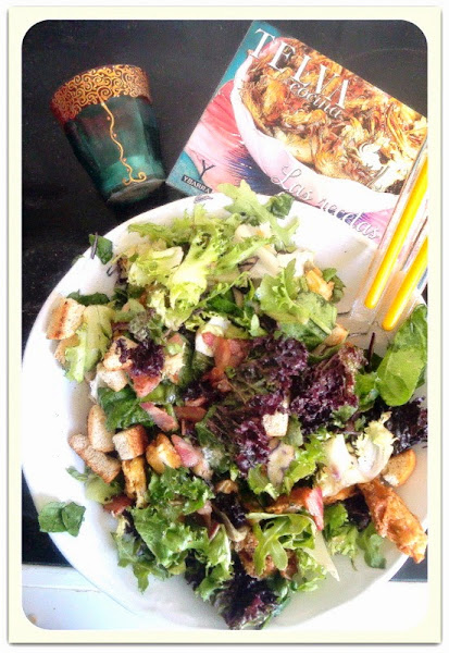 en fin, ENSALADA DE QUESO DE CABRA Y BACON, con distintos tipos de lechugas, al que le he dado mi propio toque añadiendo a la vinagreta un poco de zumo de naranja, por aquello del toque dulce, que tanto me gusta!...