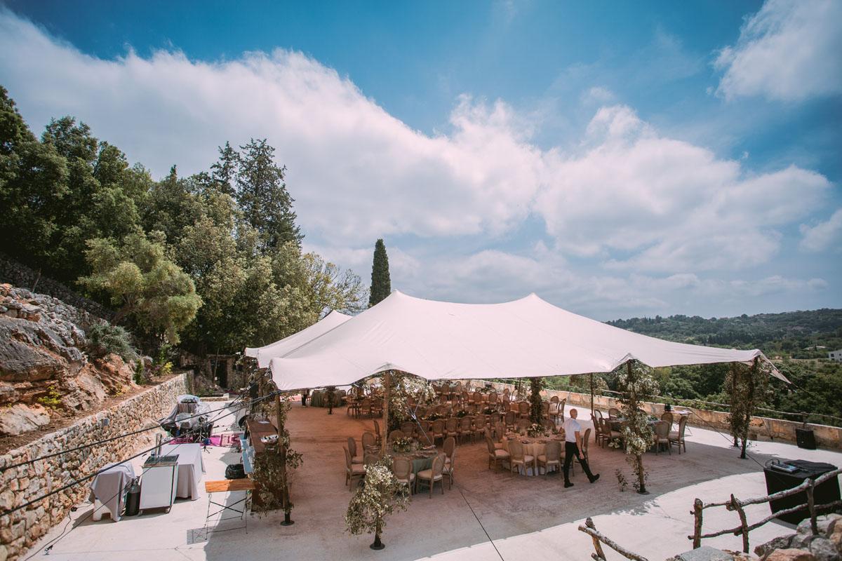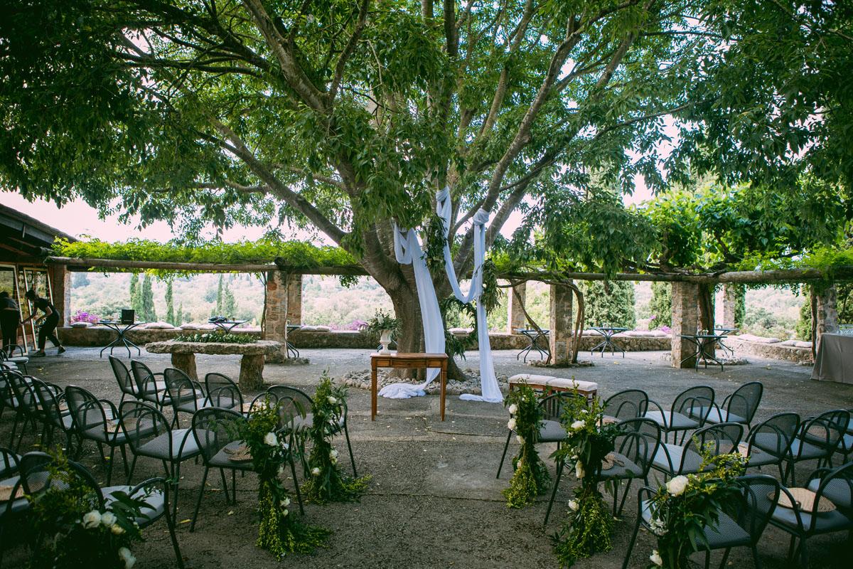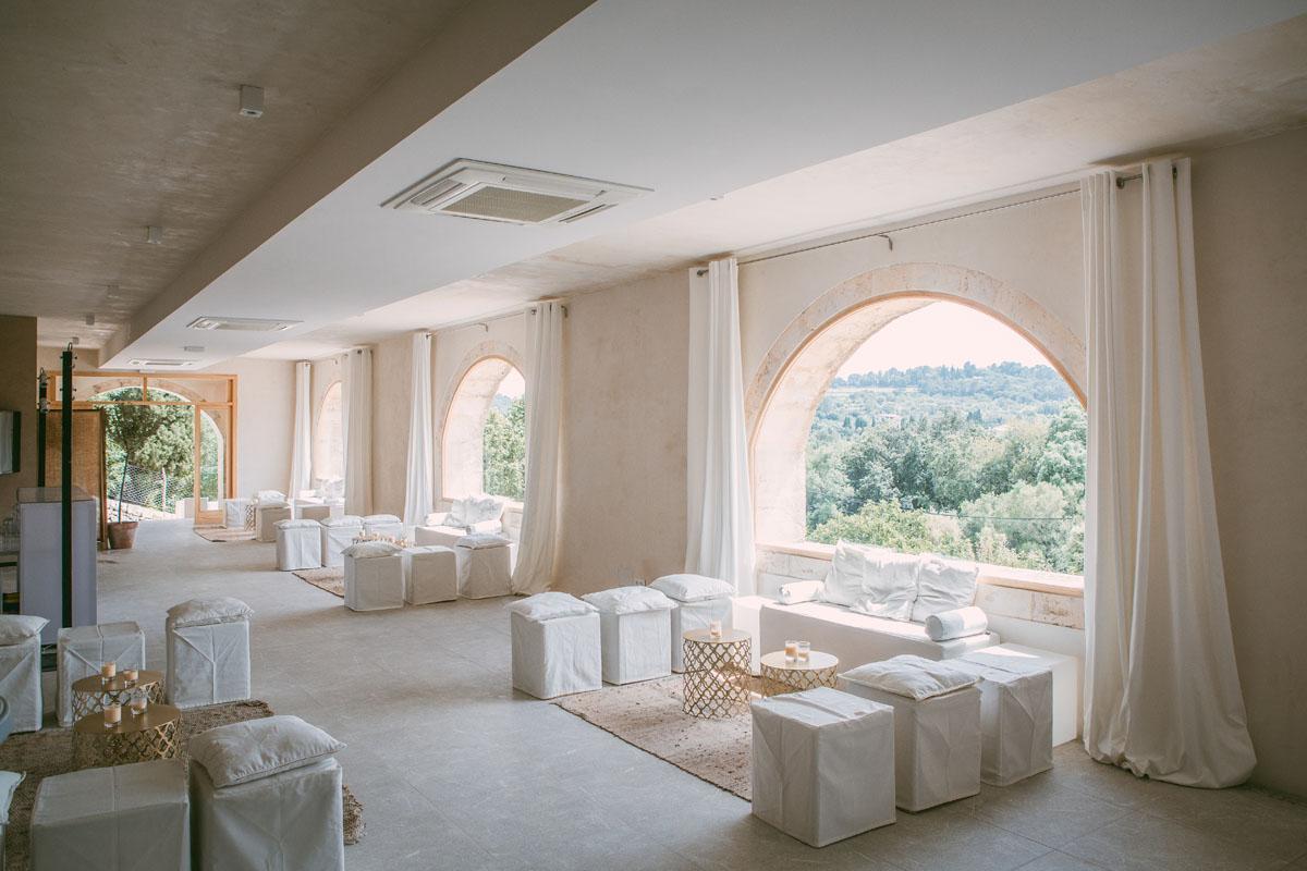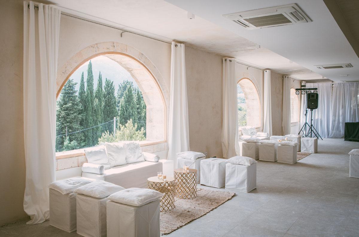 Una vez terminada la ceremonia se ofreció un aperitivo en la bonita pérgola que cubre parte de la terraza, con bancos de piedra que decoramos con cojines blancos.