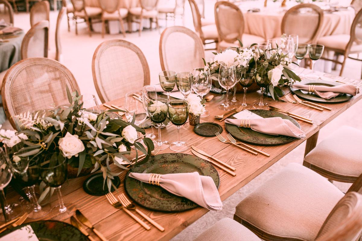 Para protegernos del sol y crear un ambiente más acogedor montamos una carpa beduina en la terraza que a la vez nos sirvió para decorar el espacio. Cubrimos todos los mástiles de la carpa con ramas de encina verde, elegimos mesas de madera combinadas con mesas redondas con mantelería color olivo y un cuidado menaje completó la decoración de la zona del almuerzo…