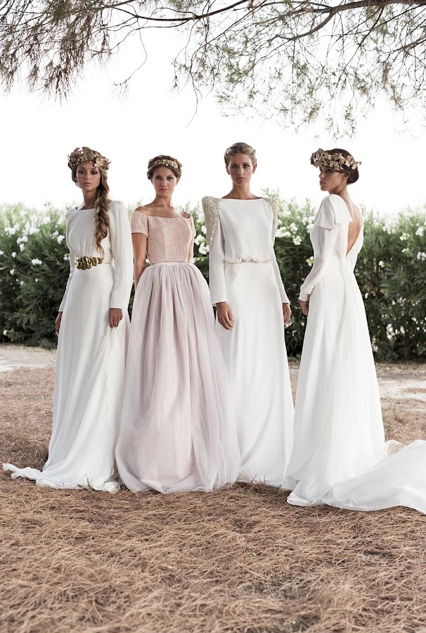 Líneas depuradas y muy frescas, tejidos 100% naturales, creppe de Seda, muselinas, gasas, tul e incluso algunos detalles de los vestidos con telas en Pedrería que encuentran en anticuaríos. Una clara propuesta por el clasicismo, la elegancia. Prima para ellas la feminidad.