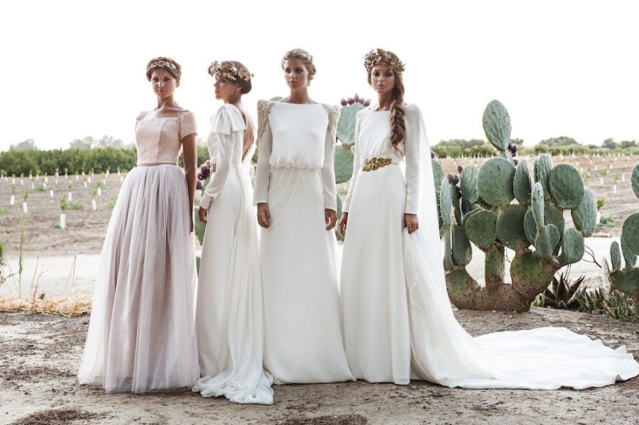 Líneas depuradas y muy frescas, tejidos 100% naturales, creppe de Seda, muselinas, gasas, tul e incluso algunos detalles de los vestidos con telas en Pedrería que encontramos en anticuaríos.