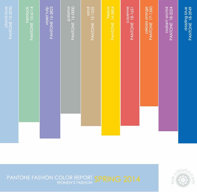Pantone Color Institute ha anunciado los 10 colores clave para la próxima temporada primavera-verano 2014 en las colecciones femeninas. Entre ellos encontramos predominio de verdes y azules pero también naranjas, amarillos y tonos suaves.