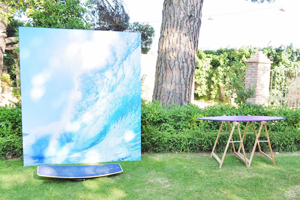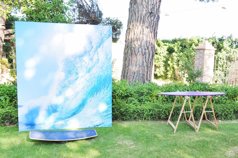 Algunos fotógrafos te dirán que es lo mismo; otros tantos que no es igual. A veces utilizamos los dos términos de forma indistinta, aunque en realidad los más puristas te dirán que el photocall es el lienzo que se coloca detrás de los invitados para hacerse fotos a su llegada (como los clásicos photocalls de la "red carpet" de los famosos) y el photobooth la cortina negra con elementos para disfrazarse que preparan los fotógrafos para el momento baile. Lo que realizamos nosotras en el fondo es una mezcla de ambas cosas, así que a nuestro producto sí le llamamos photocall... En la boda tarifeña, una gran ola con una tabla de surf para entonar todos el Surfin"USA