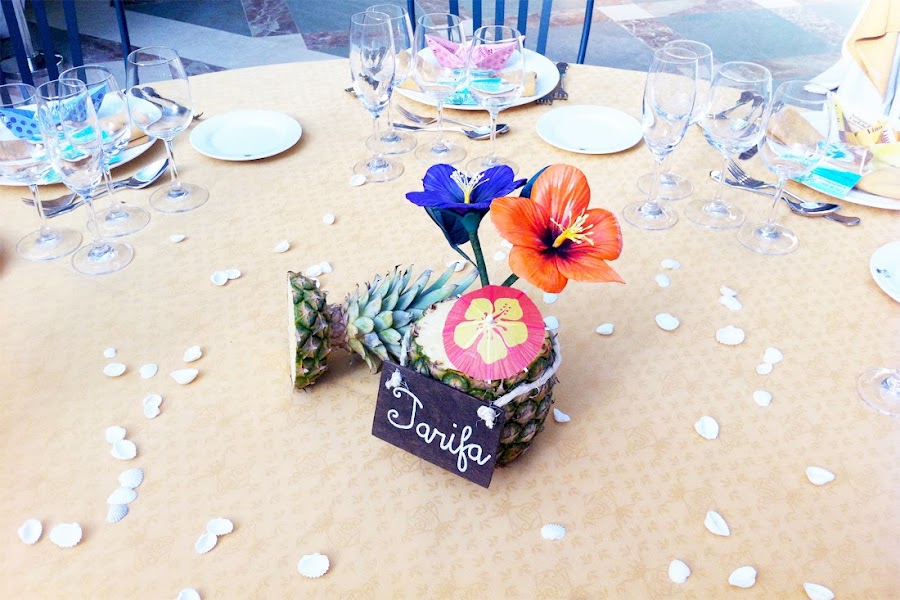 Los distintivos que permiten reconocer a las mesas o, dicho en cristiano, los nombres de la mesa. En esta boda en concreto eran nombres de locales y playas de Tarifa, el lugar en el que veranean los novios... En este caso, además, el mesero iba unido a un centro de mesa muy especial...