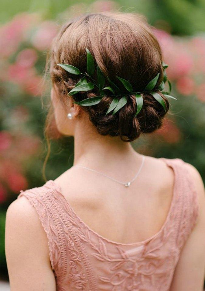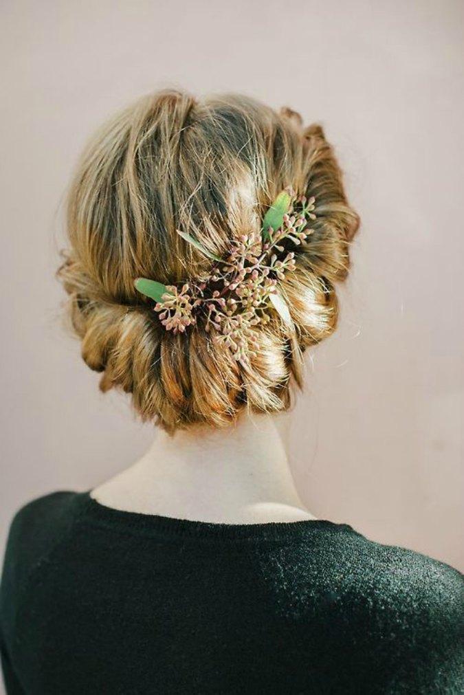 Otra opción es un recogido de mechones enlazados en la zona baja de la nuca añadiendo un adorno floral, o un moño alto añadiendo un postizo del mismo color que tu pelo.