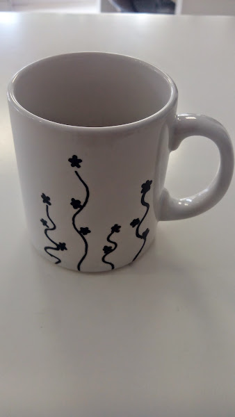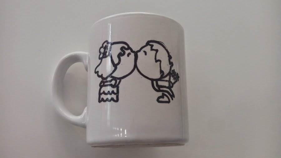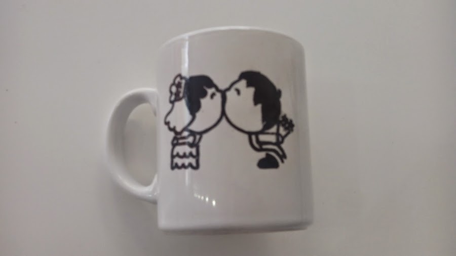 A continuación pasas con un lápiz por encima del dibujo y lo repasas entero para que se calque en la taza. Si te equivocas lo puedes limpiar con alcohol y vuelves a calcar. Retiras el papel y verás que el dibujo se queda perfectamente marcado en la taza.