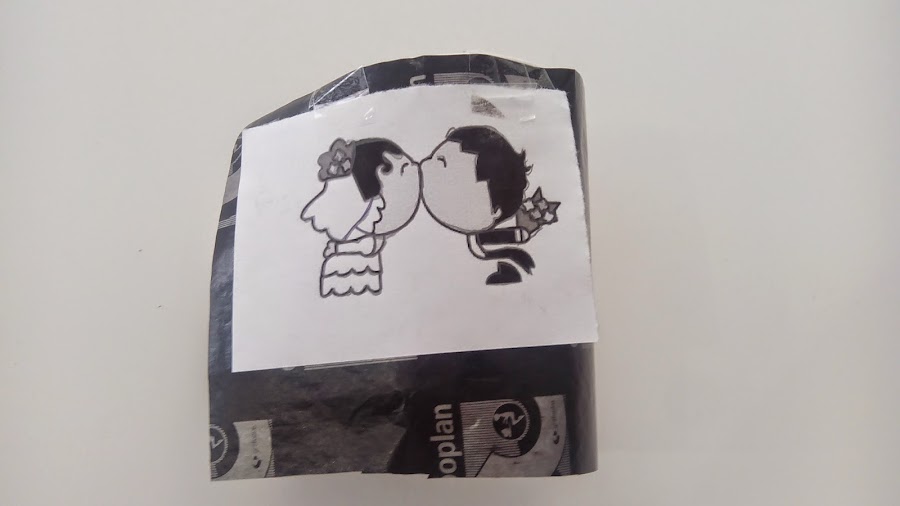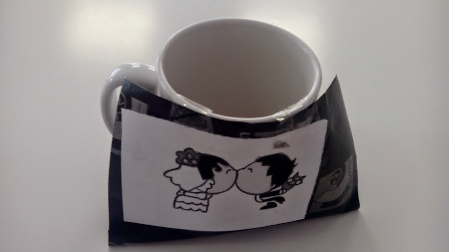 Lo primero es limpiar bien con un poco de alcohol toda la superficie de la taza para asegurarnos que no queda polvo. Después coges el dibujo que quieres plasmar y lo pegas con celo en una hoja de calco que pegarás en la taza a la altura que quieras.