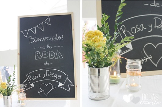 Uno más sencillo aún es este diseñado por Bodas de Cuento. Simplemente pintáis un tablero y con tiza escribís el cartel.