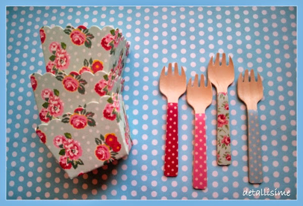 Las podéis combinar con unos tenedores pequeños monísimos (10,5 cms) por ejemplo rosas con topitos...o azules con topitos, o rojos con topitos..y, por supuesto con unas flores que van muy a juego....