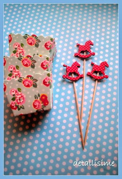 Y también podéis poner en la mesa, unos palillos de madera con estos caballitos rojos con topitos (que no pueden ser más monos (12 cms) con los que también podéis hacer también brochetas....o adornar tartas, bizcochos, cupcakes....