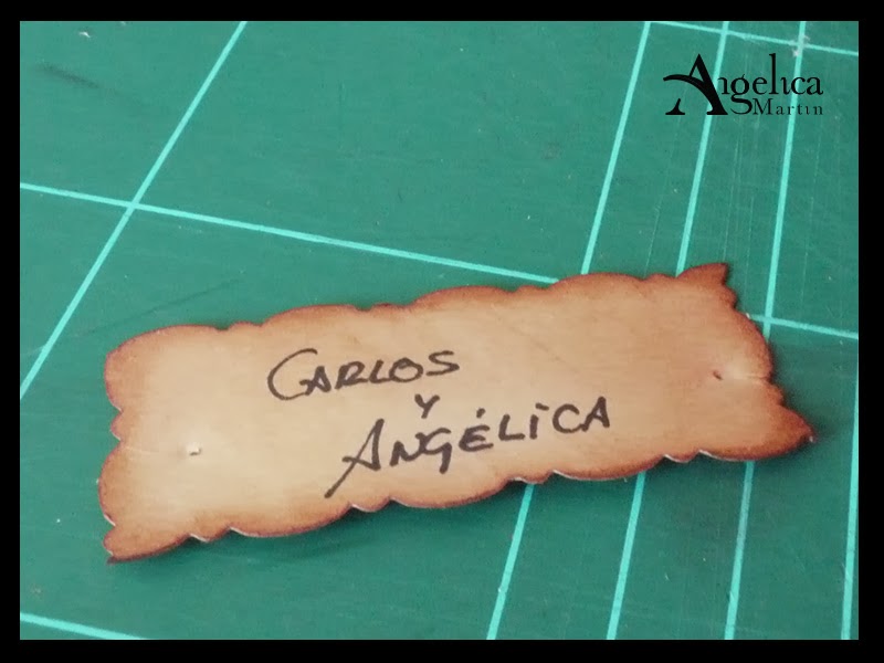 Con una tijera de bordes cortaremos un rectángulo donde pondremos los nombre de los dos. :)