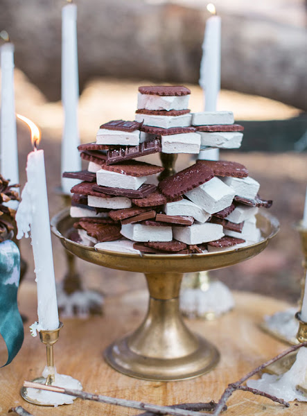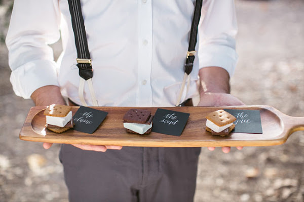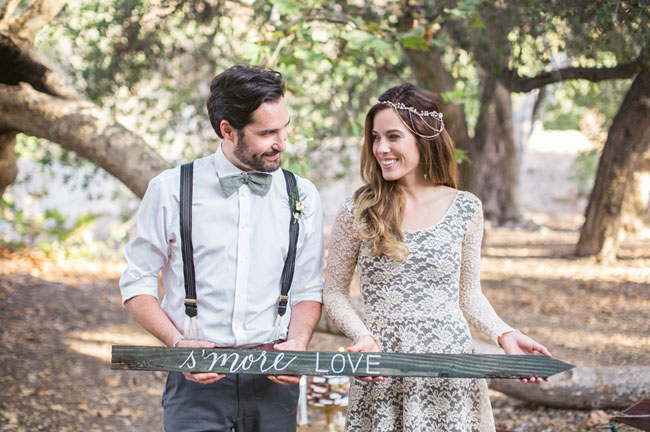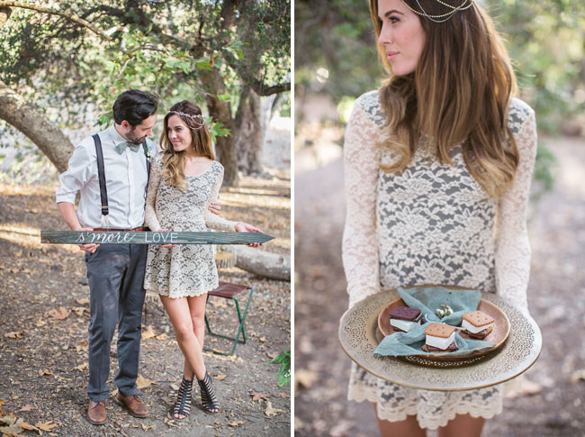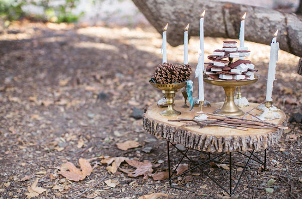 Aprovecha dos looks diferentes en tonos blancos y pastel para crear dos estilos diferentes en la misma sesión, como hacen éstos novios, que después aprovechan para colocar unas sillitas, una mesa hecha con un tronco de madera y muchas velas......