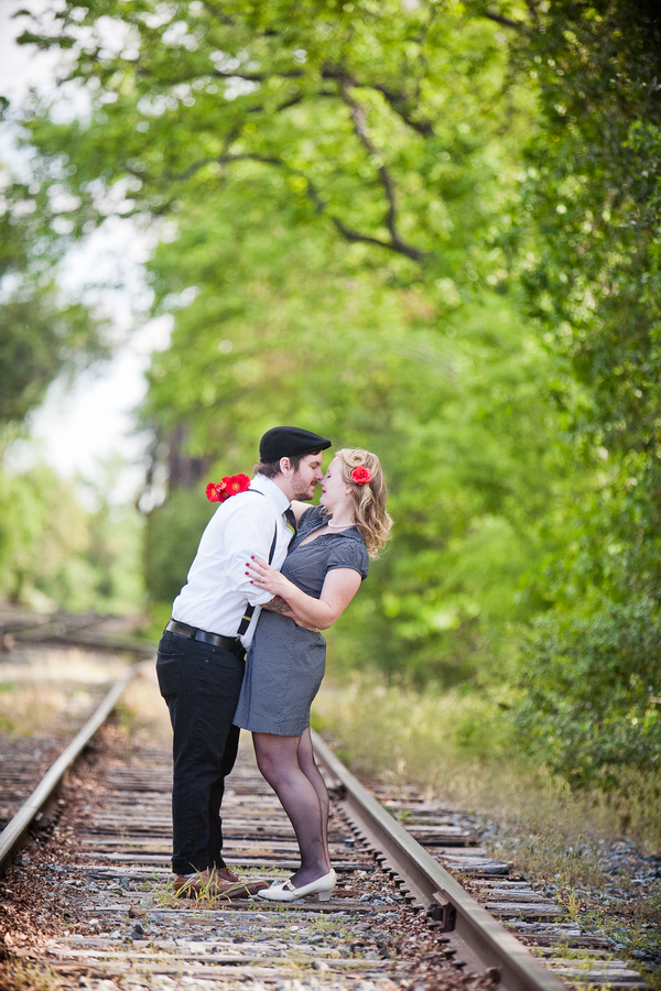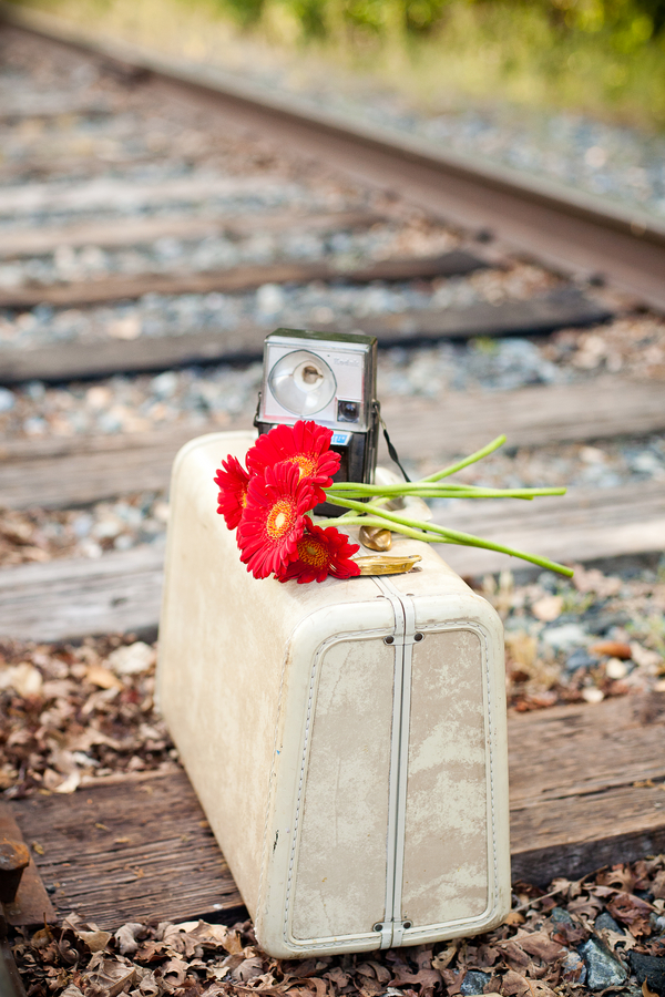 Para el novio, pantalones negro, camisa blanca, corbata, tirante y alguna boina molona. Para éste preboda el decorado elegido es una estación de tren, y complementos como una polaroid antigua, una maleta y unas gerberas rojas no podía faltar.