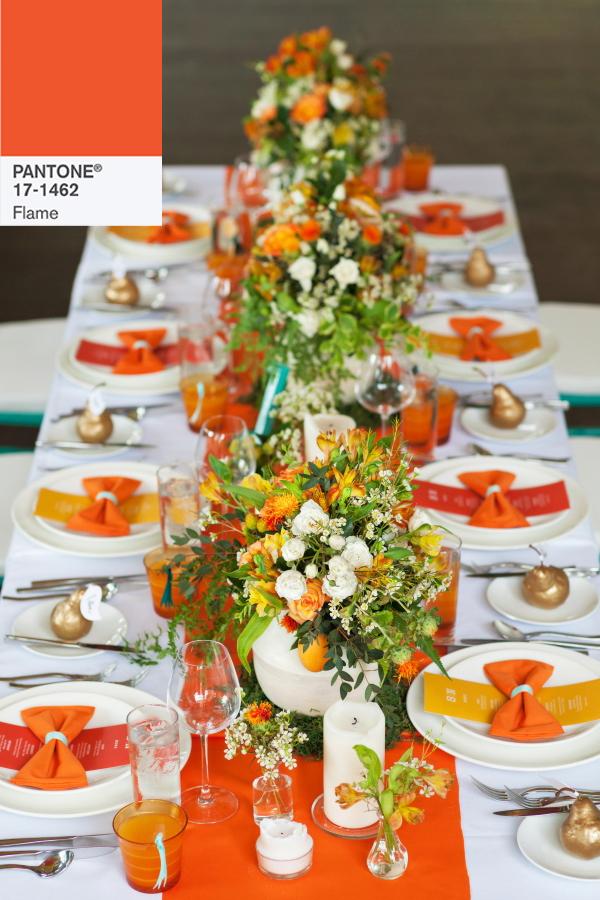 Para mesas divertidas y refrescantes nada mejor que este naranja lleno de energía. Flame nos da miles de posibilidades y sin complicaciones, como con esta combinación con blanco. Solo necesitaremos una vajilla blanca sencilla y textiles a todo color.