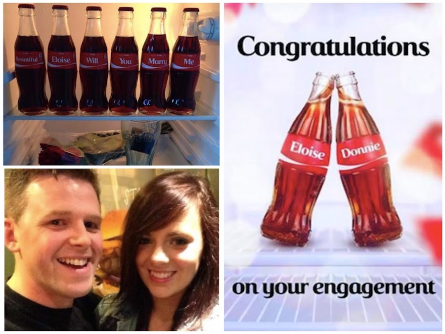 Hace unas semanas, leía la noticia de una propuesta muy original. Donnie McGilvray? le pidió a su novia Eloise que se casase con él con botellas de Coca Cola personalizadasque había colocado previamente en la nevera. La feliz pareja compartió la imagen en la página de Facebook de Coca Cola con el siguiente mensaje: "Thanks Coca-Cola for all the help, she said yes!" (Gracias por la ayuda, ha dicho que si!). En menos de un día había acumulado más de un millón de likes. La marca de refrescos más famosa del mundo, finalmente respondió al mensaje con con una felicitación.