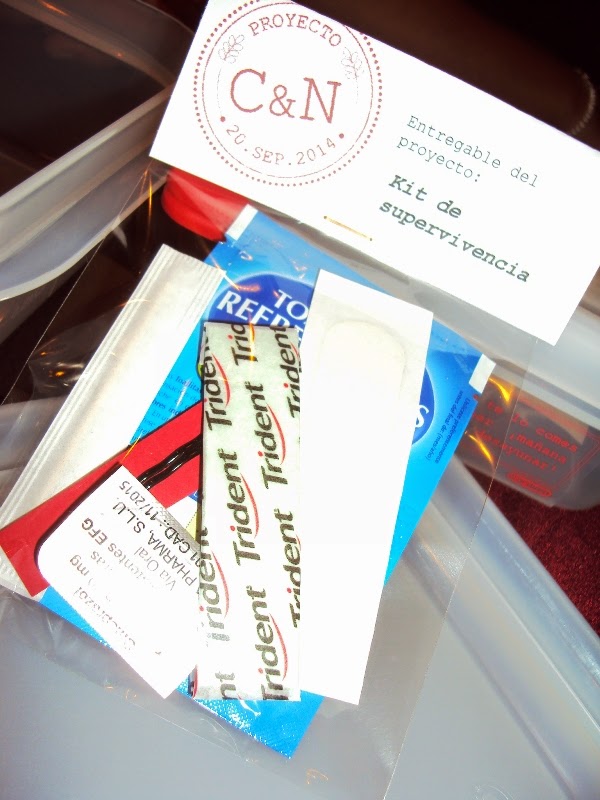 lo ví! Hace muy poquito escribimos un post a cerca de ellos (podéis leerlo AQUI) pero nunca los había visto en persona. Era muy muy completo: un chicle, un palillo, tiritas, omeoprazol, una clip para el pelo, una toallita refrescante... ¡No le faltaba detalle! Y todo ello metido en un táper con el logo de la boda.