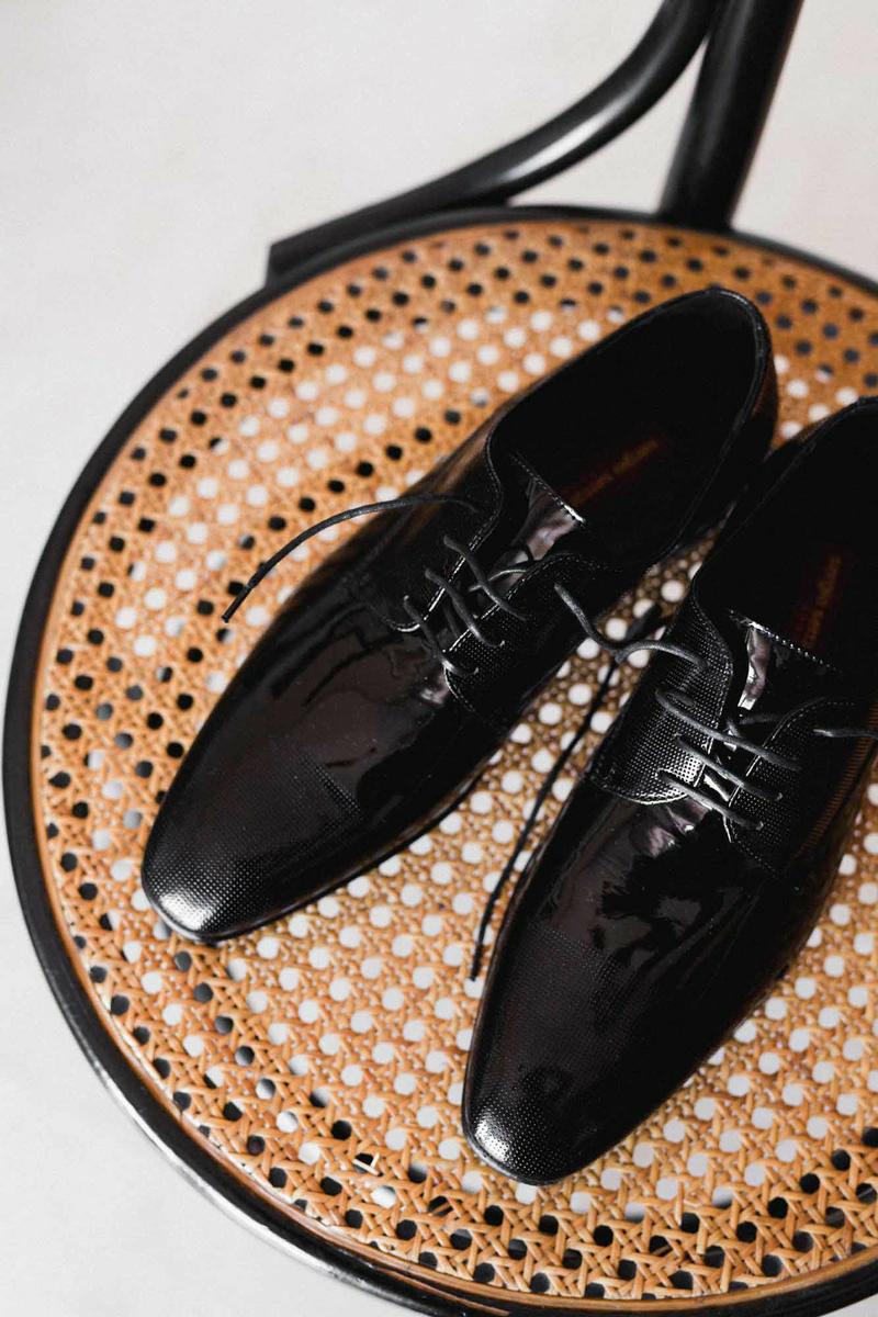 Es importante que no sean muy brillantes, unos Oxford con cordones negros sería la opción más segura. En caso de llevar gran, es correcto ponerse zapatos de charol, sino no. Para bodas informales en campo, playa, etc. se admiten hebillas y mocasines.