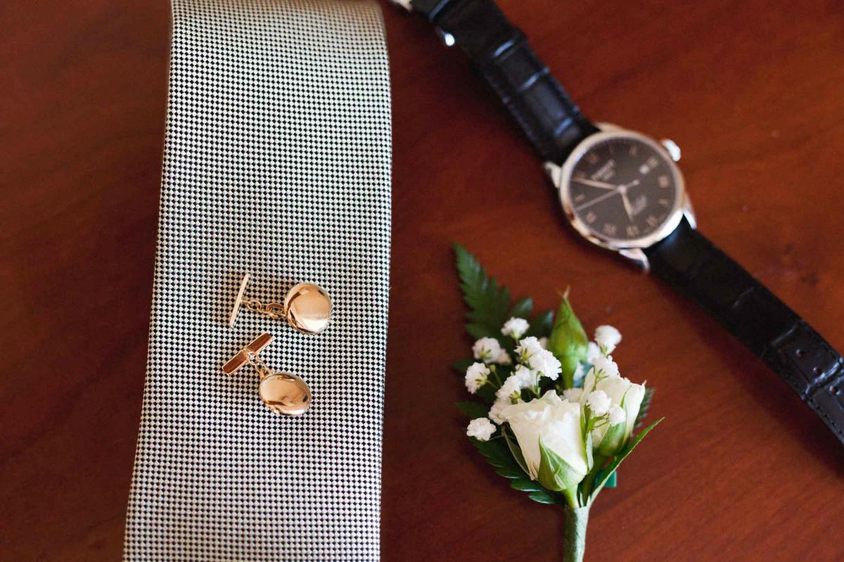 Son las joyas que lleva el novio. Una apuesta segura es que sean discretos y elegantes. El prendiendo en el ojal es un ramillete compuesto por una o varias flores de dimensiones muy pequeñas que va a juego con el ramo de la novia. Los calcetines de hilo escocés y del mismo tono que el zapato, excepto si el pantalón es blanco, en ese caso el calcetín debe ser blanco o sin calcetín.