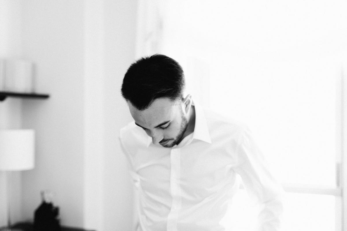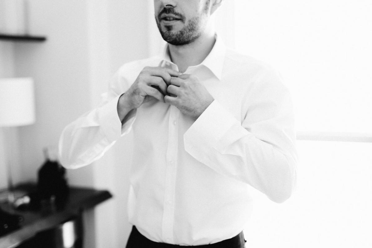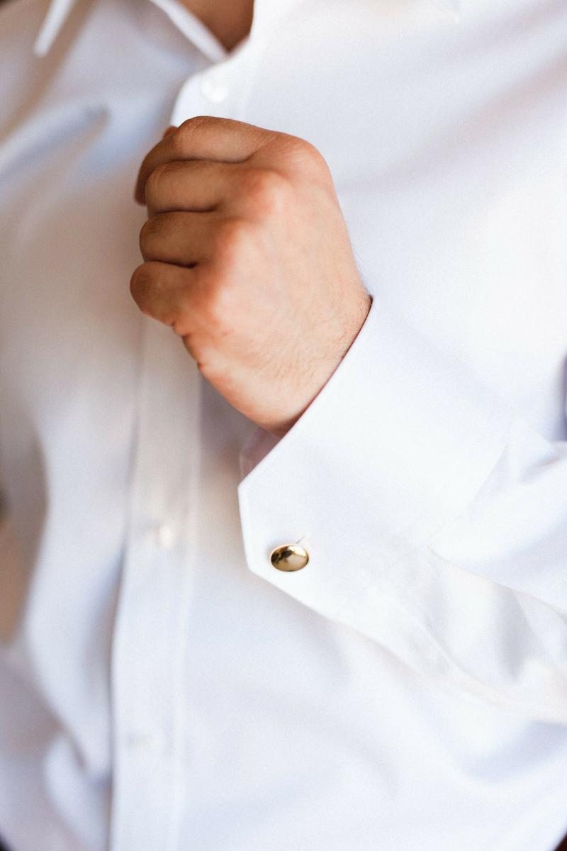 Lo ideal es una camisa lisa blanca con cuello alto o inglés ya que estiliza y es elegante. Para que los picos en los cuello no pierdan su forma utiliza ballenas o varillas, éstas pueden ser personalizadas con la fecha de vuestro enlace, vuestros nombres o una frase corta bonita. Ten en cuenta que vas a llevar gemelos, por lo que a la hora de elegir la camisa fíjate en que tenga puño doble.