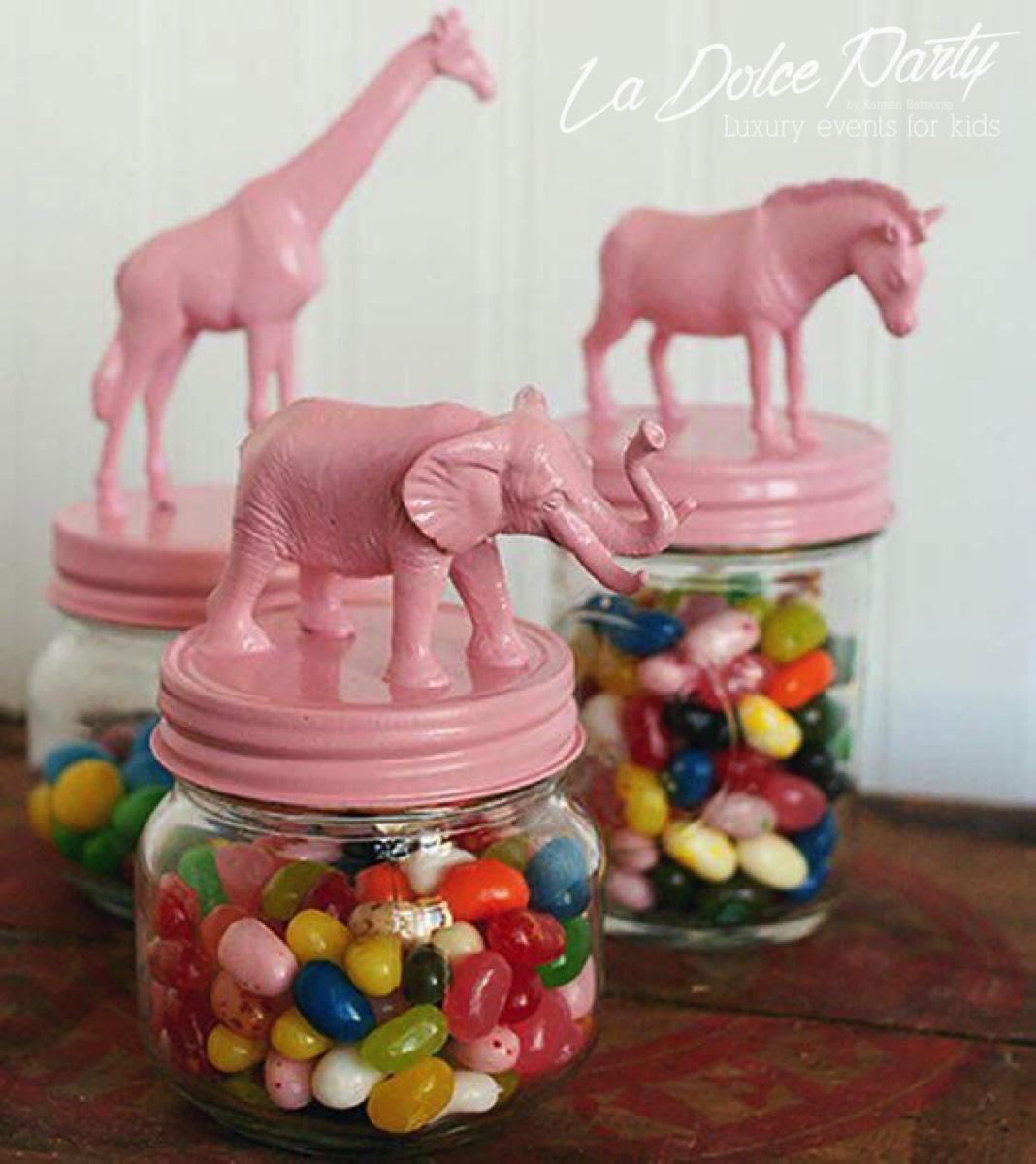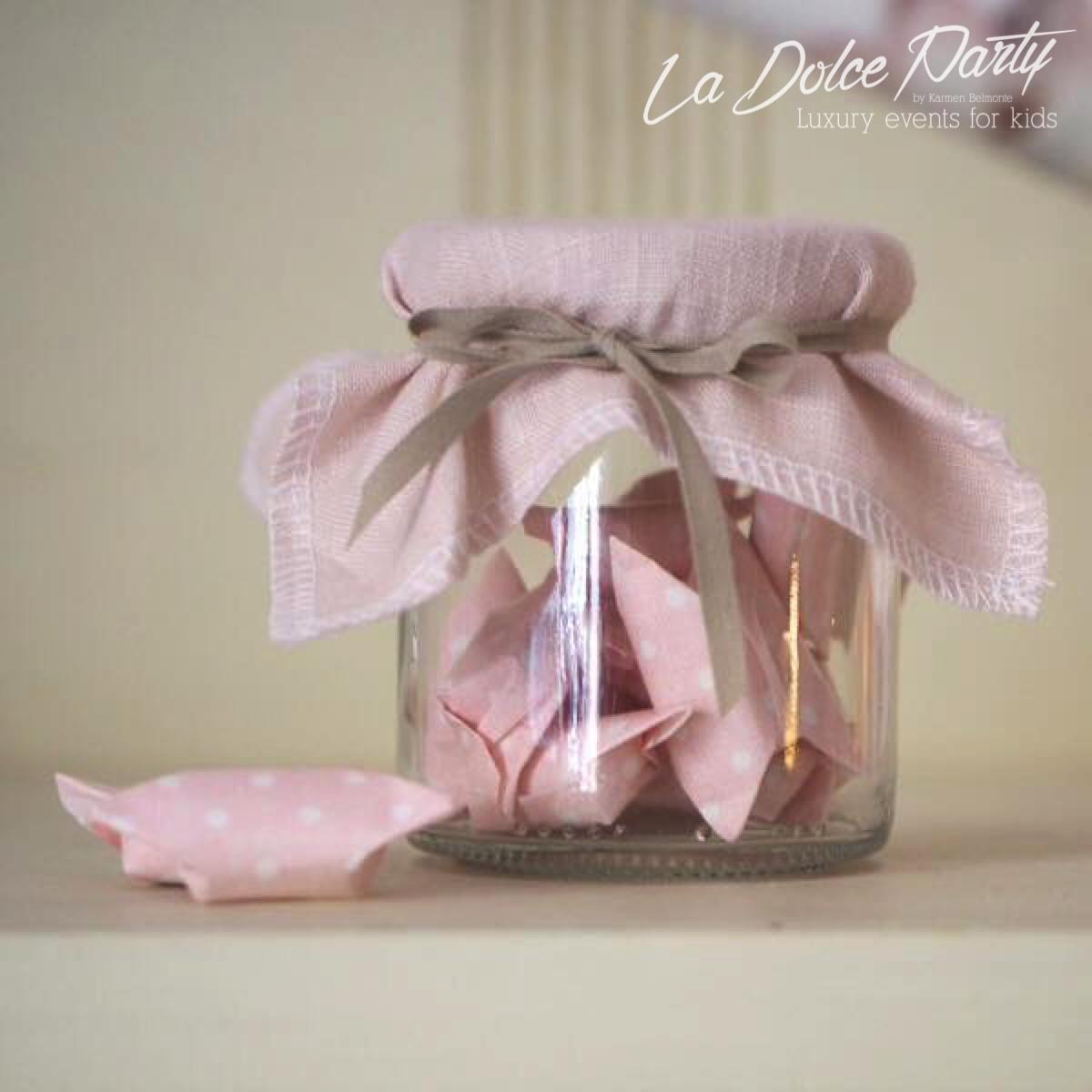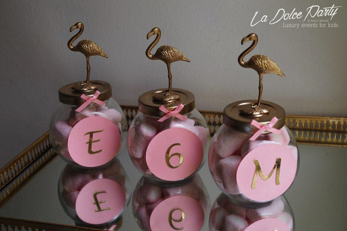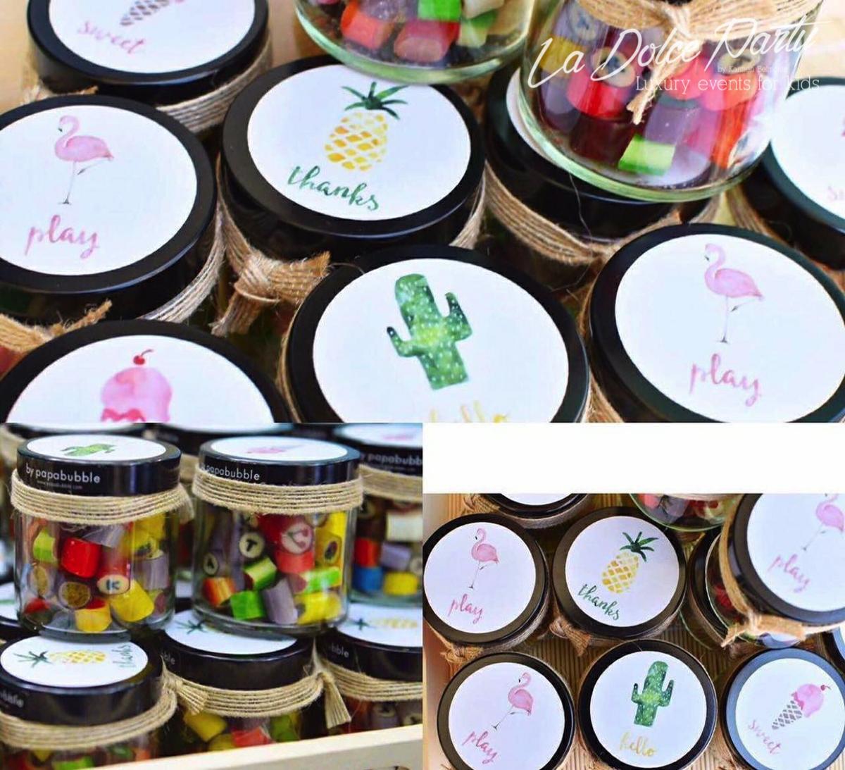 Un clásico pero que siempre queda bien. Desde los más básicos con el recordatorio en la tapa, a carritos de cristal decorados con puntilla, yute o lacitos de colores dependiendo del tipo de evento y preferencias. Una nueva apuesta y que gusta mucho en los eventos tematizados, es decorarlos con algún elemento de la fiesta, en este caso flamencos, y pintados al color que se desee, todo hecho a mano!