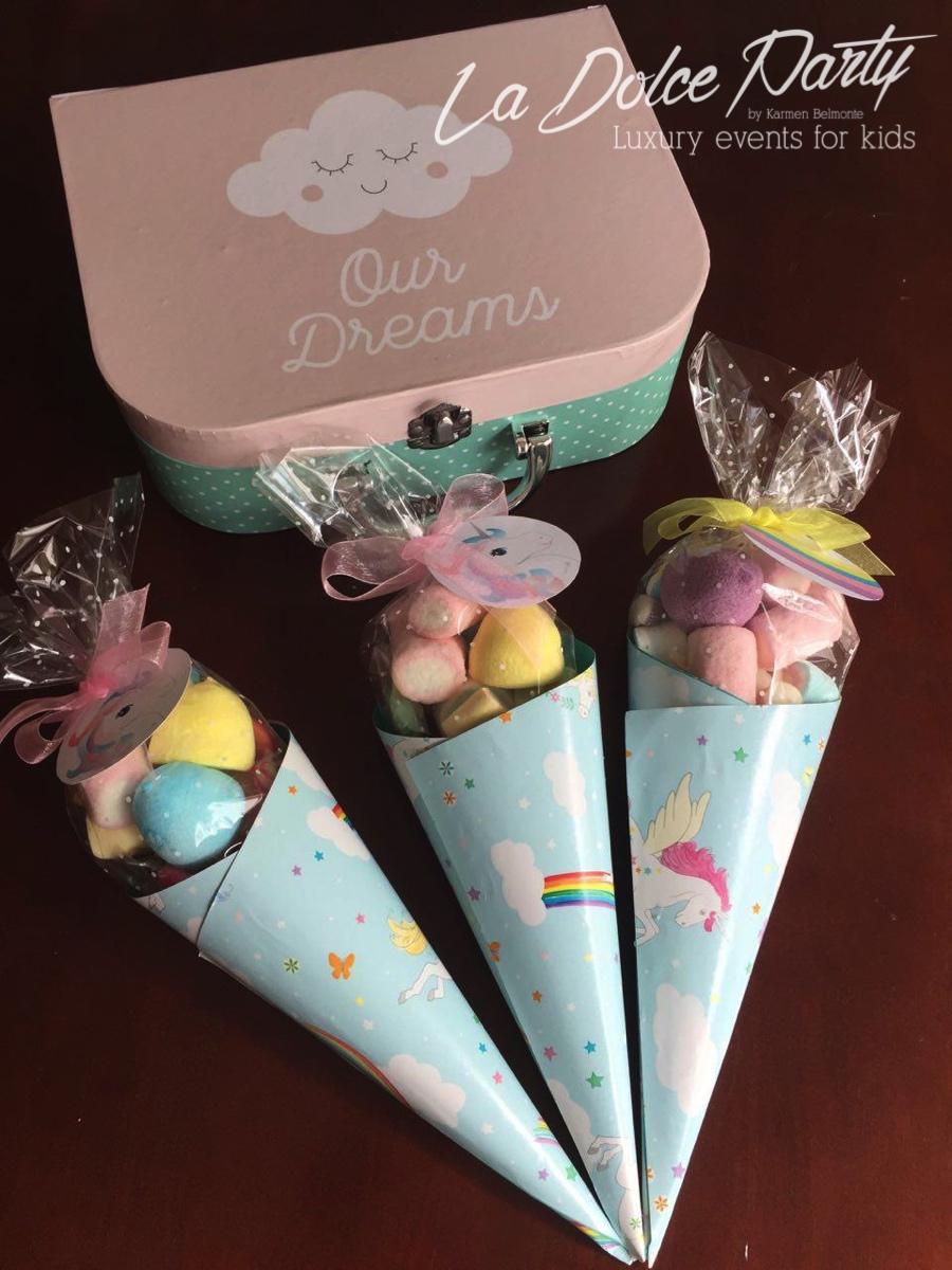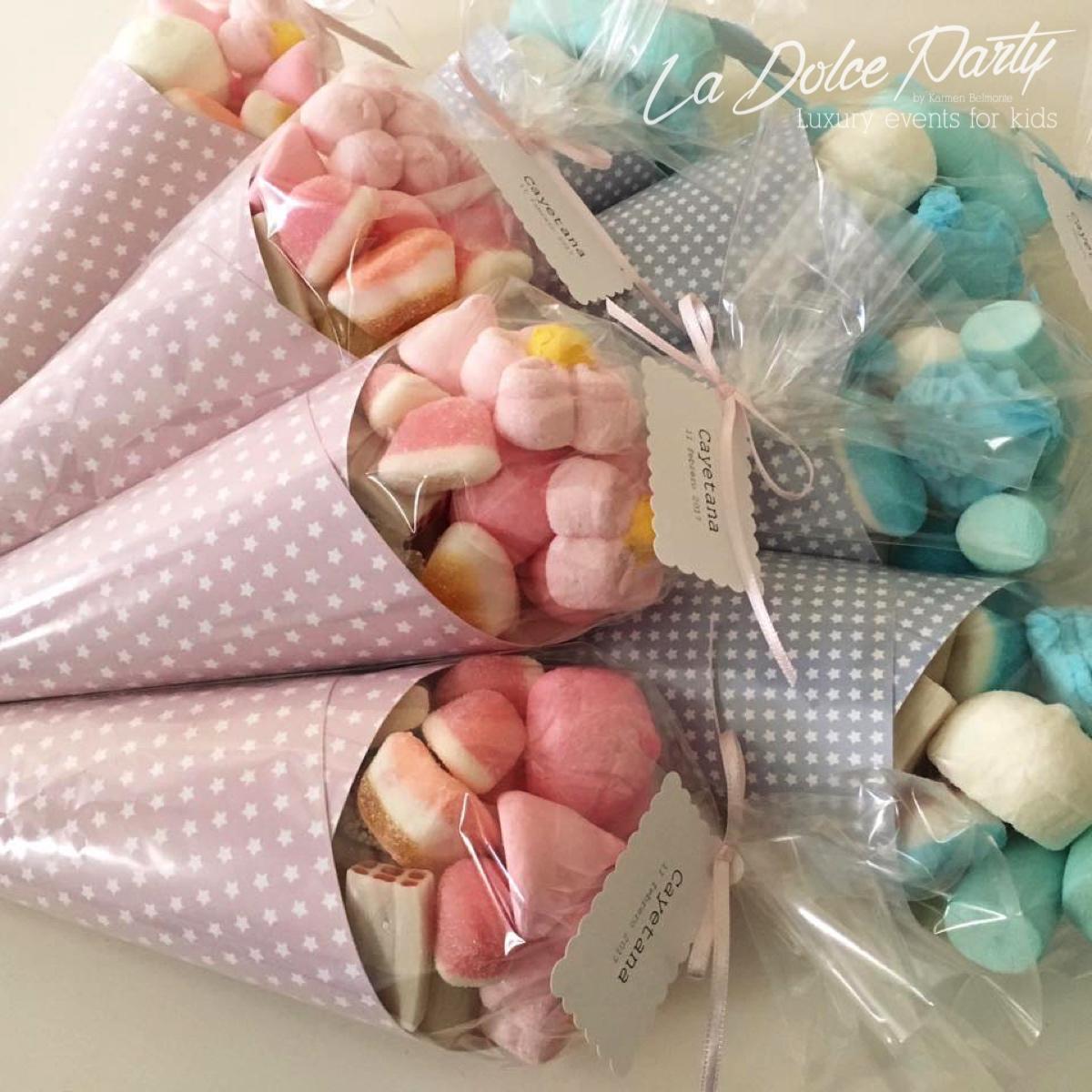 Un detalle muy bonito son los conos de chuches, que se personalizan según la decoración del evento y temática. Decoran el candy bar y después se reparten entre los invitados, éxito total!
