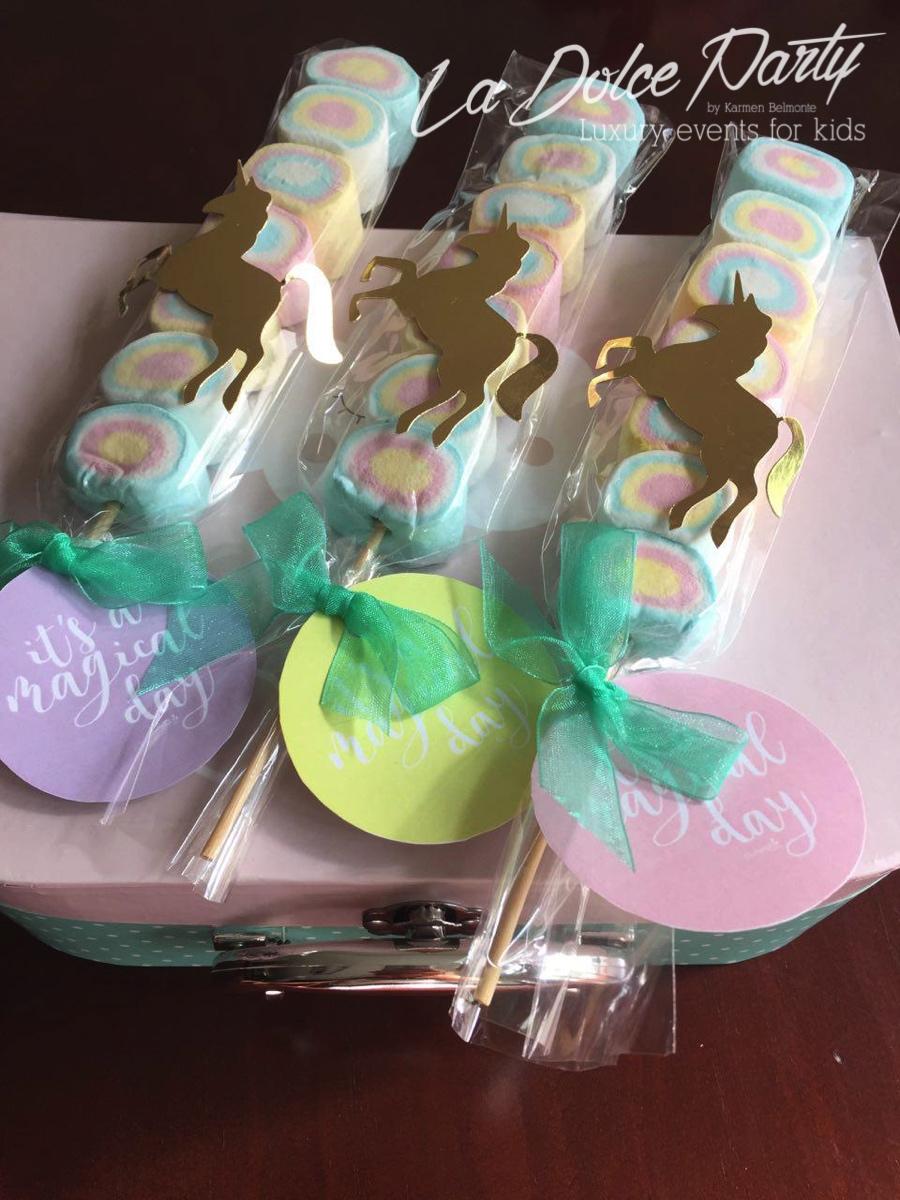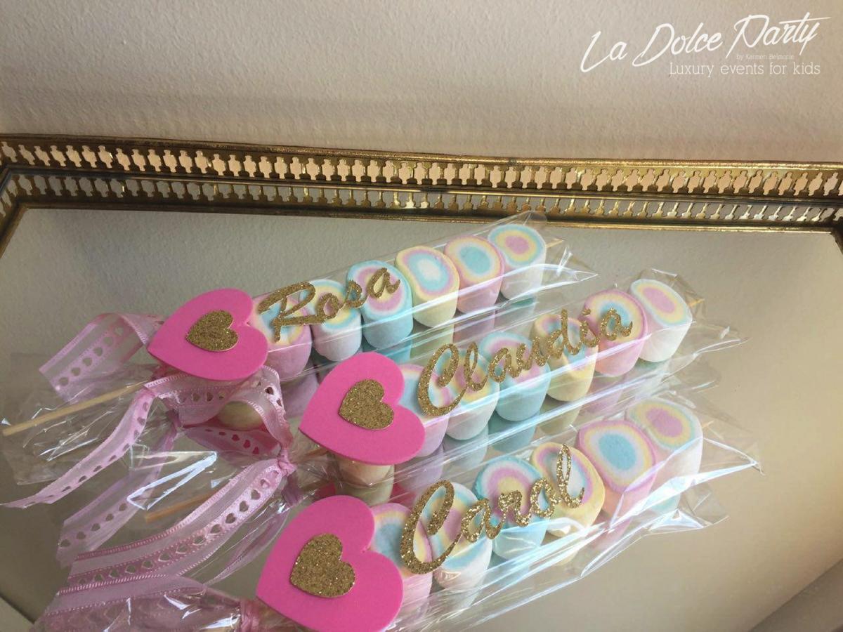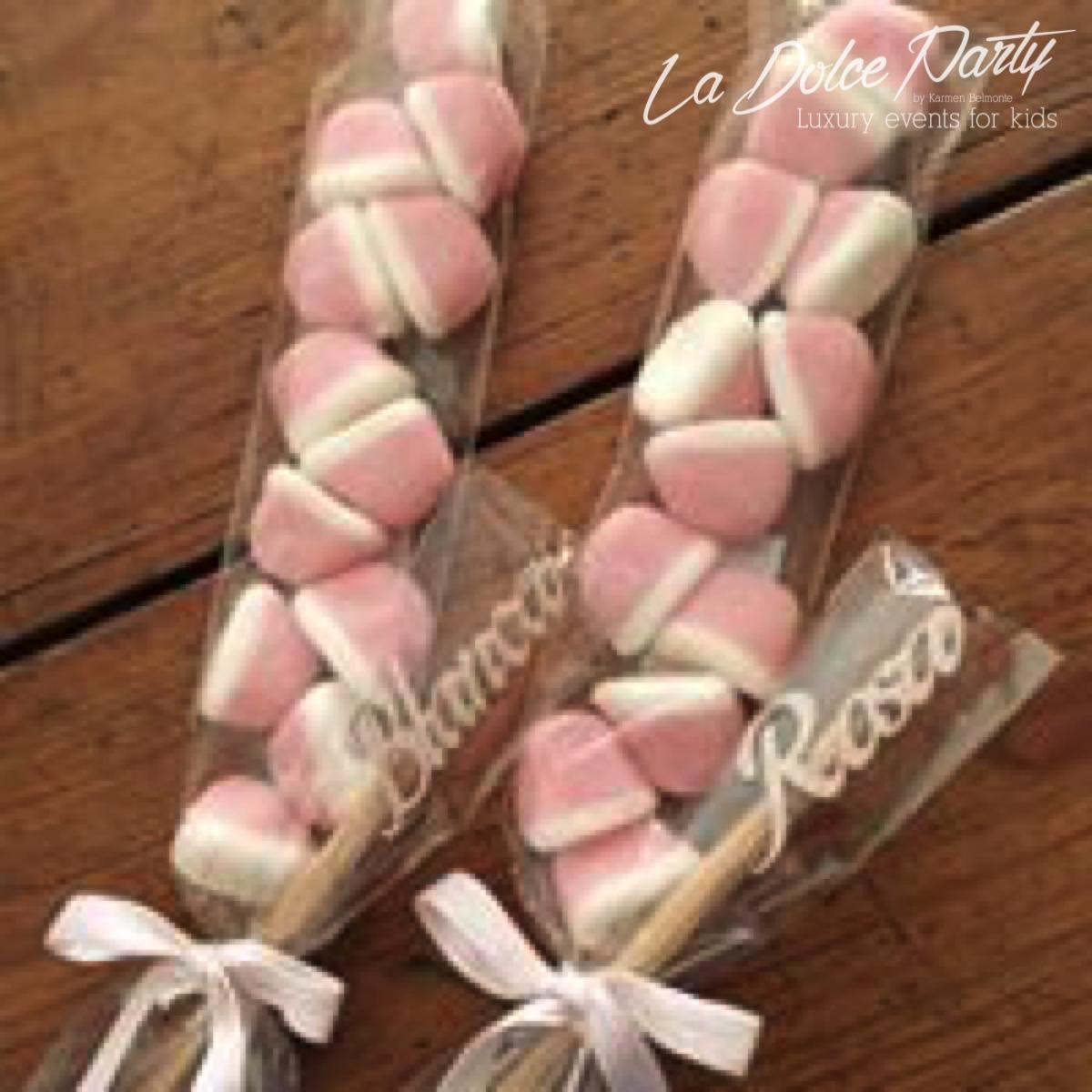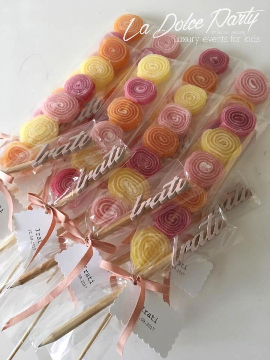 Buscando más opciones están las brochetas de chuches, que también se personalizan con el tema del evento, con el nombre, la inicial, etc y son muy prácticas y finas para regalar