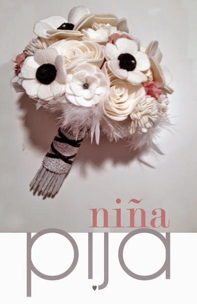 En esta ocasión, como en el ramo original el material principal es el fieltro y los colores son blanco y negro, pero le hemos añadido unas flores realizadas en crepé color rosa empolvado, y en el remate del tallo hemos hecho una fusión de tallos vistos con puntilla plateada y cinta negra.