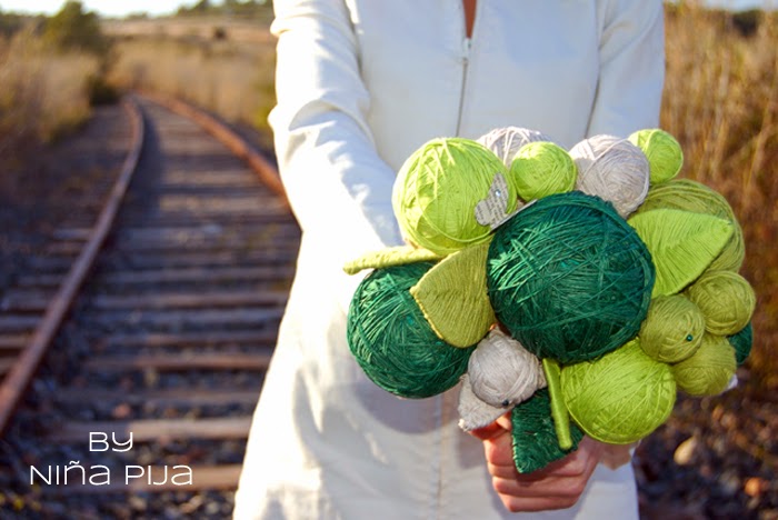 Así que me envió unas fotos de ramos que vio por internet y que se ajustaban a lo que andaba buscando y nos pusimos a trabajar, unos emails por aquí... unas pruebas por allá..., lana, cuerda, papel de libro y swarovski...