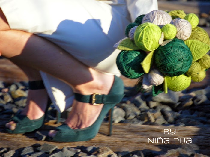 Y le pusimos un perfecto complemento a su boda, haciendo este bouquet en tonos verdes, ya que sus zapatos eran de este color, unos zapatos preciosos por cierto, de la diseñadora Chie Mihara, que me enamoraron desde el primer momento que me los enseño.