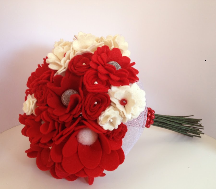 Esta realizado en fieltro rojo y blanco compuesto por diferentes tipos de flor.