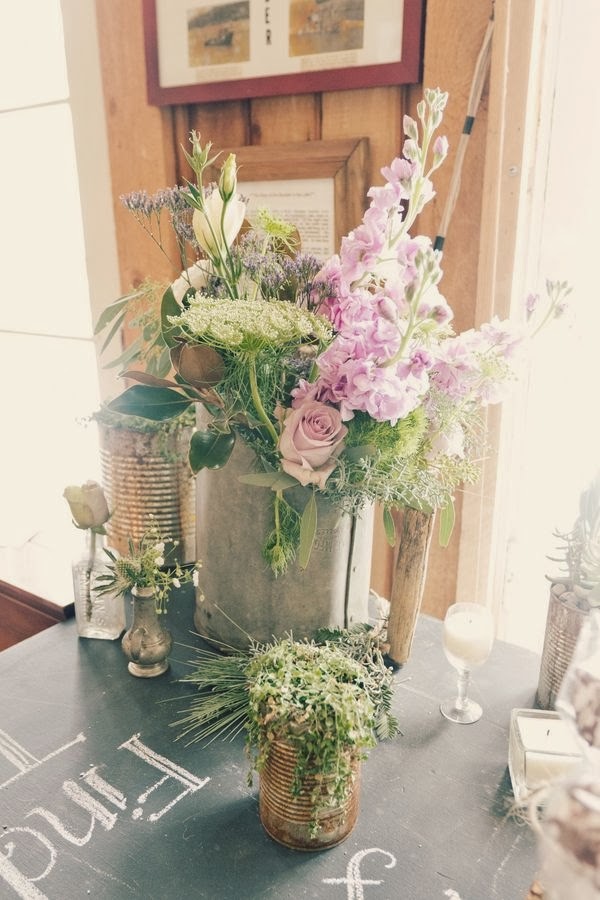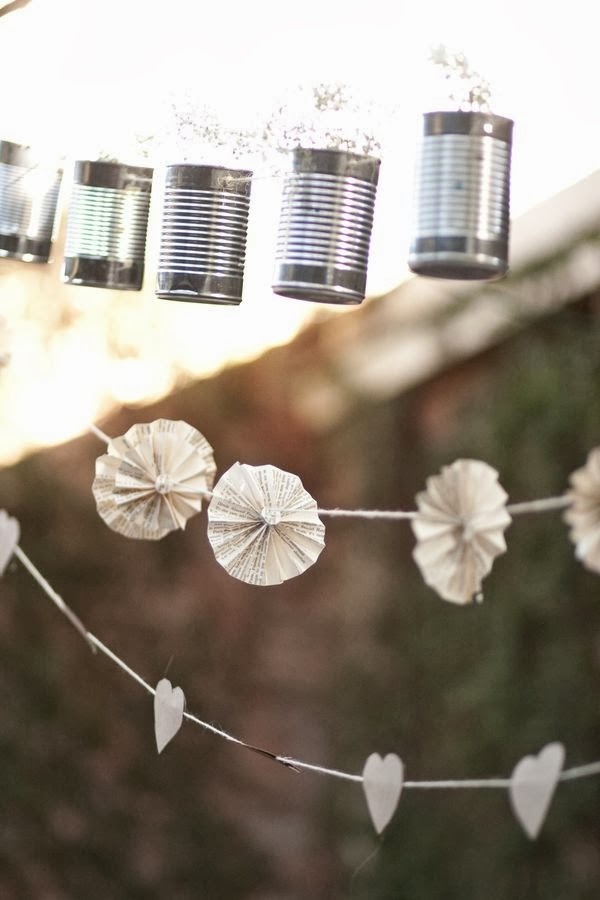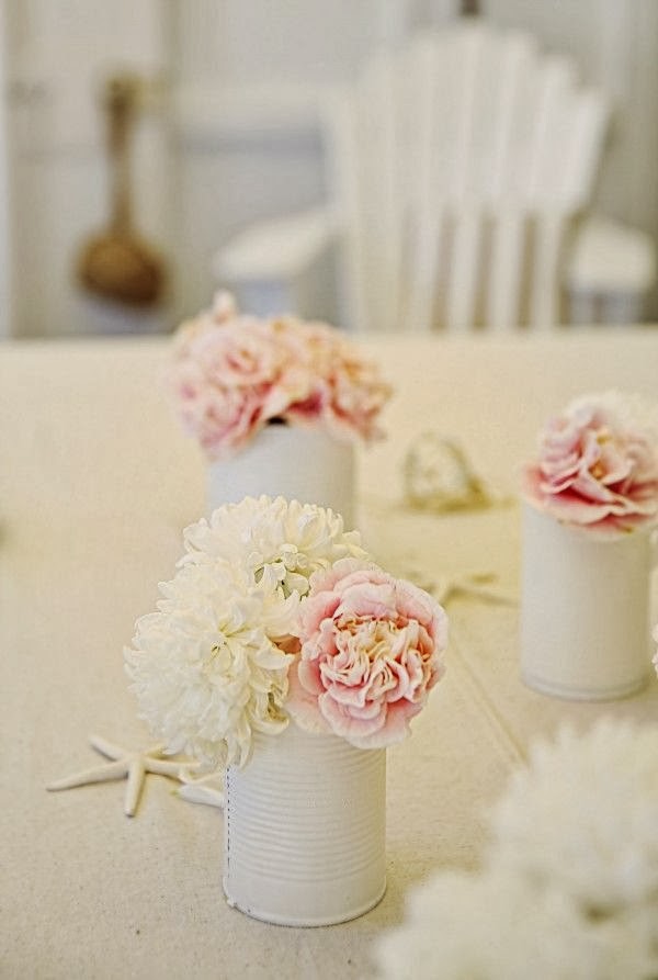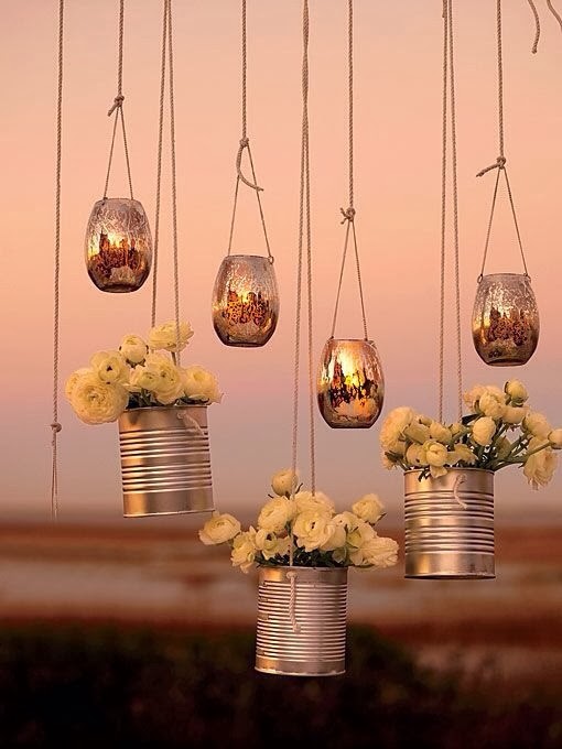 Antiguamente y hasta no hace mucho las latas metálicas de conserva tan sólo se utilizaban como cacharros viejos que se ataban en la parte trasera del coche de los novios, pero hoy día pueden tener alguna otra utilidad, y además de barata podemos conseguir ese efecto boho chic o campestre tan de moda hoy día en el mundo bodil; así que ya podéis empezar a reciclar latas y utilizarlas como pequeños jarroncitos para las flores, como porta velas o, incluso para una candy; se pueden dejar tal cual con el color plateado o dorado natural o bien pintarlas en los tonos elegidos en la boda, forrarlas con papeles bonitos, con cuerda, hacerles agujeros y meterles una vela, colgarlos con cadena o cuerdas. Las posibilidades son mil, tan sólo es utilizar la imaginación y acoplarlas al estilo de la boda.