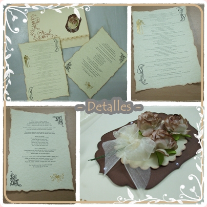 El primer trabajo es una carpeta donde van metidas las lecturas que se hicieron en la ceremonia, impresas en papel de pergamino y adornadas con sellos y un embosado con polvos dorados.