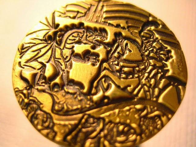 Omella Grabados realizó los troqueles de estampación a partir de un sello original de Marcel Escofet, con el han realizado copias en latón envejecido a un precio muy económico. El resultado es de muy alta calidad y os puedo asegurar que mi padre esta orgulloso de que su trabajo pueda ser disfrutado por cualquiera persona y no solo de la gente mas pudiente.