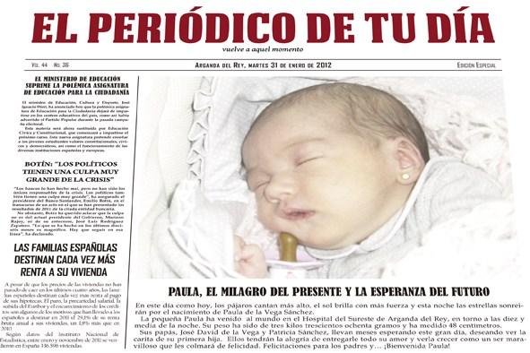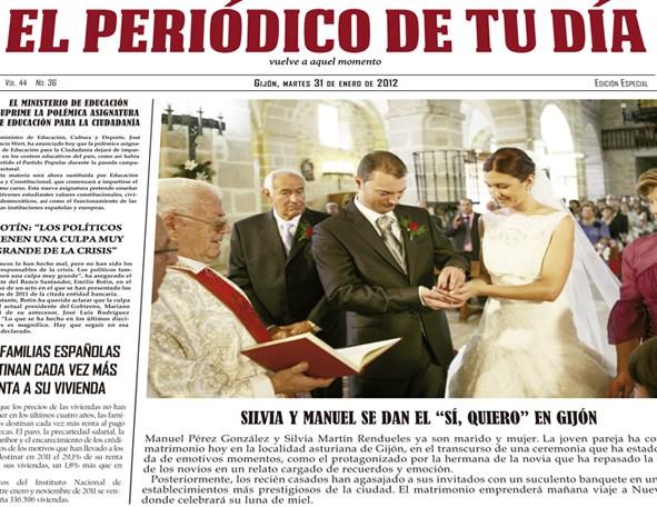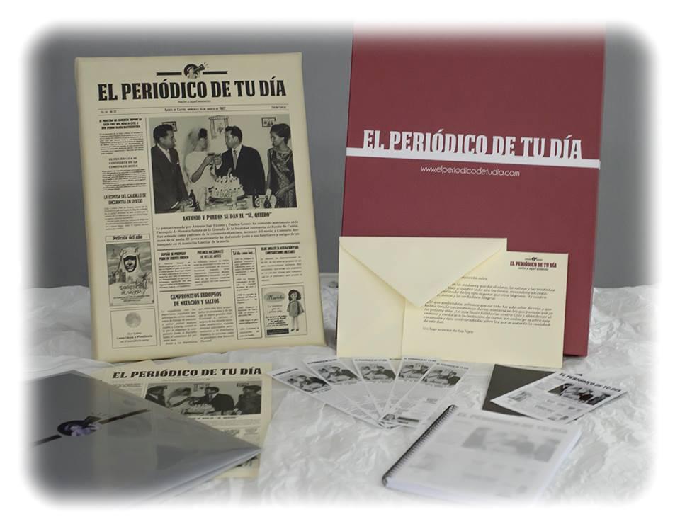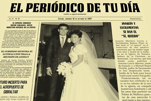 Justamente, es lo que nos ofrece El Periódico de tu Día. Se trata de un periódico con todas las noticias que sucedieron el día en que se casaron, pero que además incluye la noticia más importante de todas, su Boda.