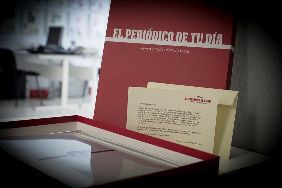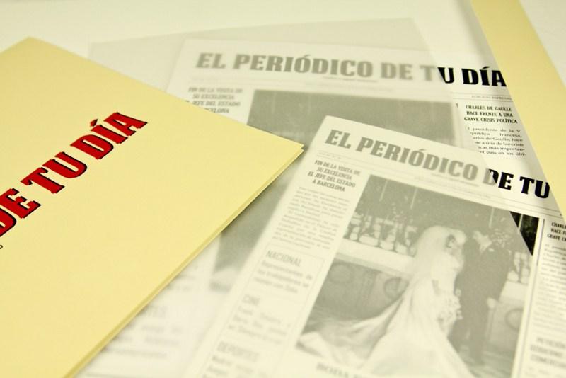 Se presenta en dos variantes. Podeis elegir entre una primera plana, con las noticias más destacadas de ese día, que podrán colgar en cualquier rincón de casa y así poder verlo a diario, o un periódico de 8 páginas, en el que El Periódico de tu Día se encargará de buscar todas las noticias de esa fecha, programación, cartelera…e incluirán los detalles más destacados de la boda, así como un resumen en fotografías de su gran día.
